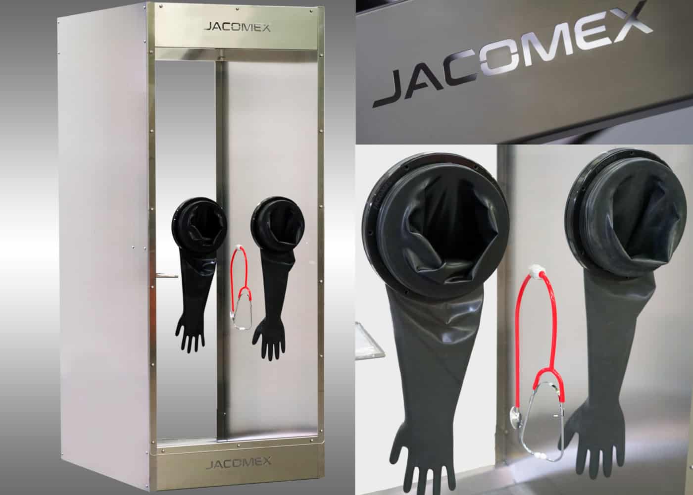 The cabin, delivered by JACOMEX in flat packs, has the undeniable advantage that it can be quickly assembled anywhere and fixed to the floor by means of special slots provided for this purpose. An assembly manual and online video are available to ensure proper assembly of the structure and gloves. Once the assembly is in place, tests can easily be started immediately. Supplied as a unitary module, it is nevertheless possible to envisage the juxtaposition of two or more protection booths. Offered in a standardized kit form, the Covid[cab] module can also be customized for additional safety reinforcement measures according to special customer requirements, and depending on the evolution of sanitary requirements. As an example, the cabin could be customized into a closed cabin with filtered ventilation system, vacuum, with communication interphones and decontamination systems.